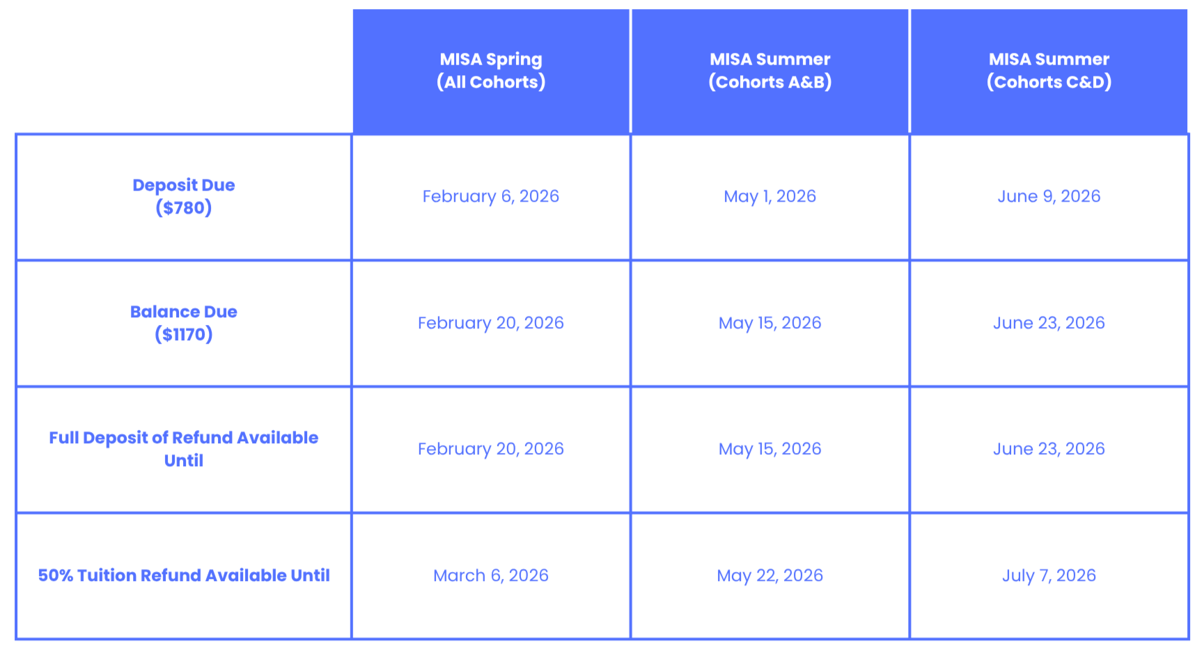 Deposit: A 40% deposit ($780) is due upon acceptance into the program by February 6, 2026 (Spring Cohorts), May 1, 2026 (Summer Cohorts A&B), June 9, 2026 (Summer Cohorts C&D)