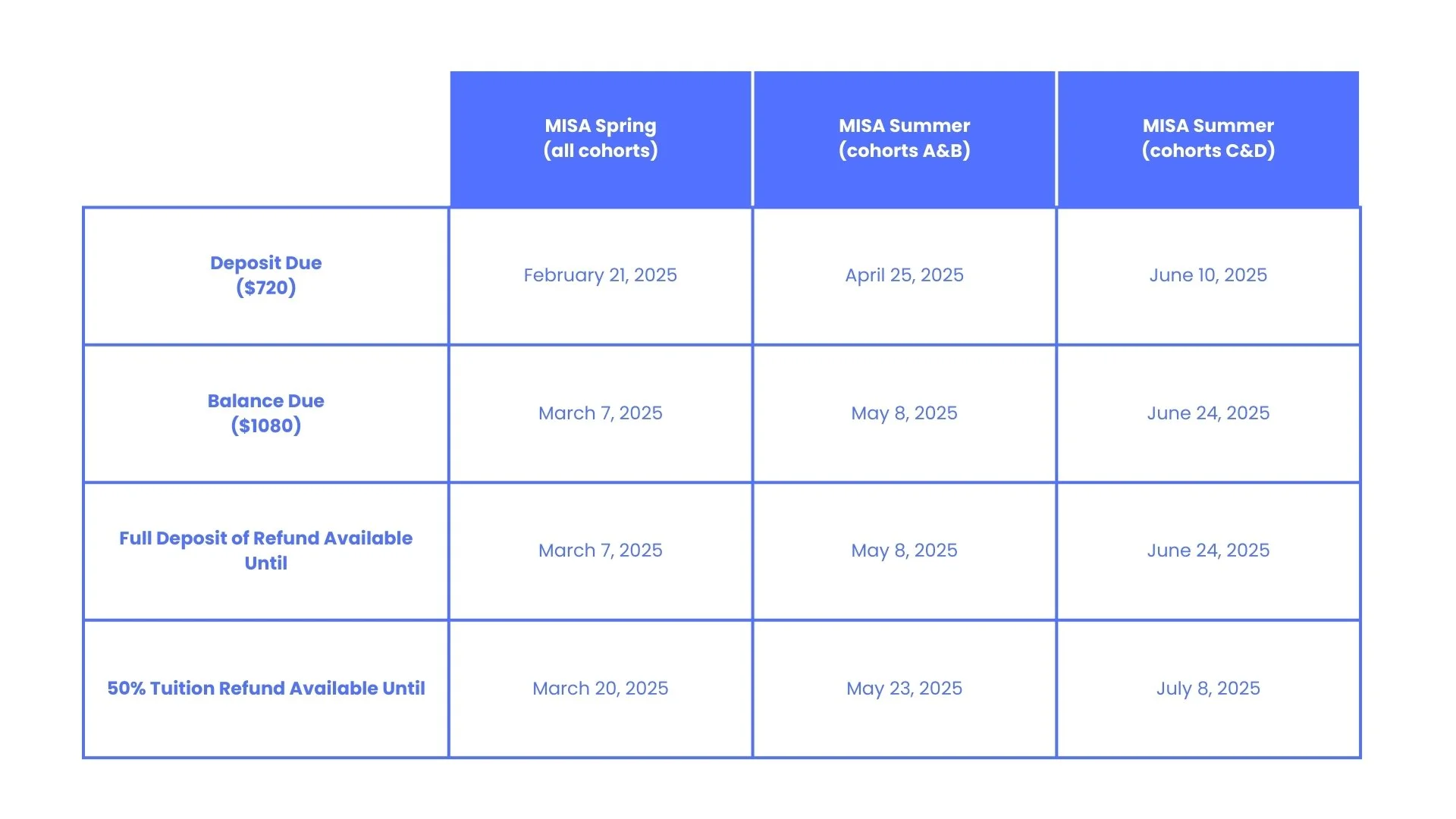 If MISA cancels the program for any reason, all participants will receive a full tuition refund (no refunds will be issued for the application fee). Alternatively, participants can apply their payment as a credit toward a future cohort. In the event of cancellation, MISA will make every effort to notify participants promptly.